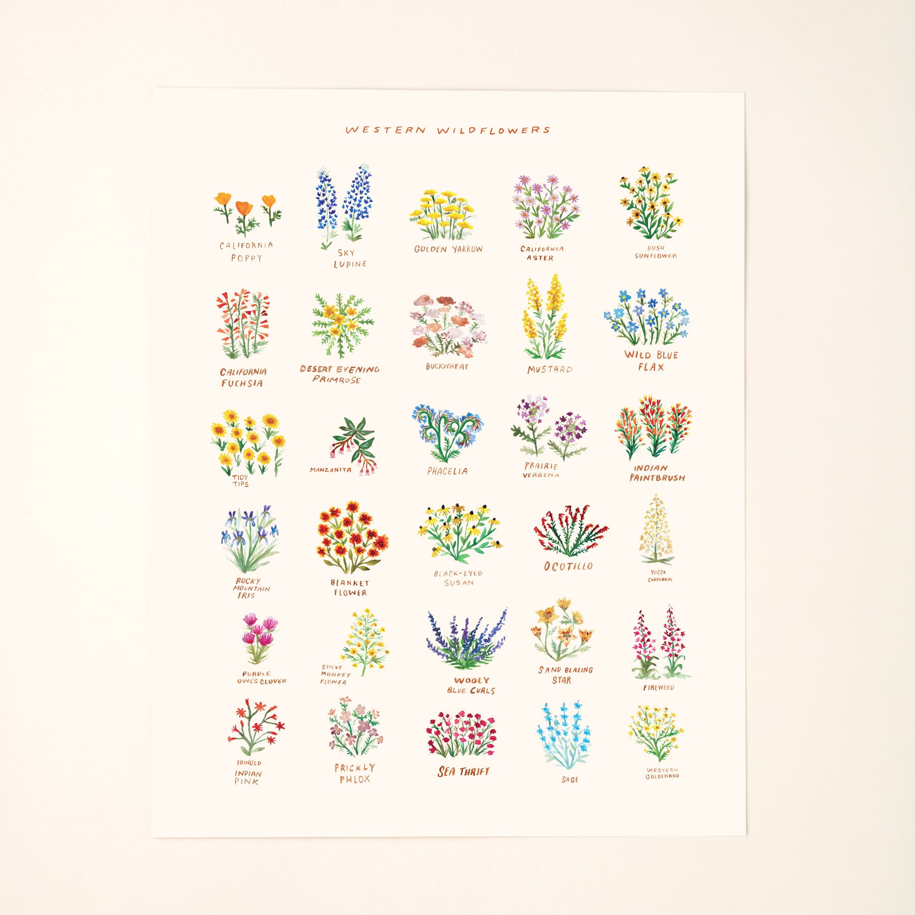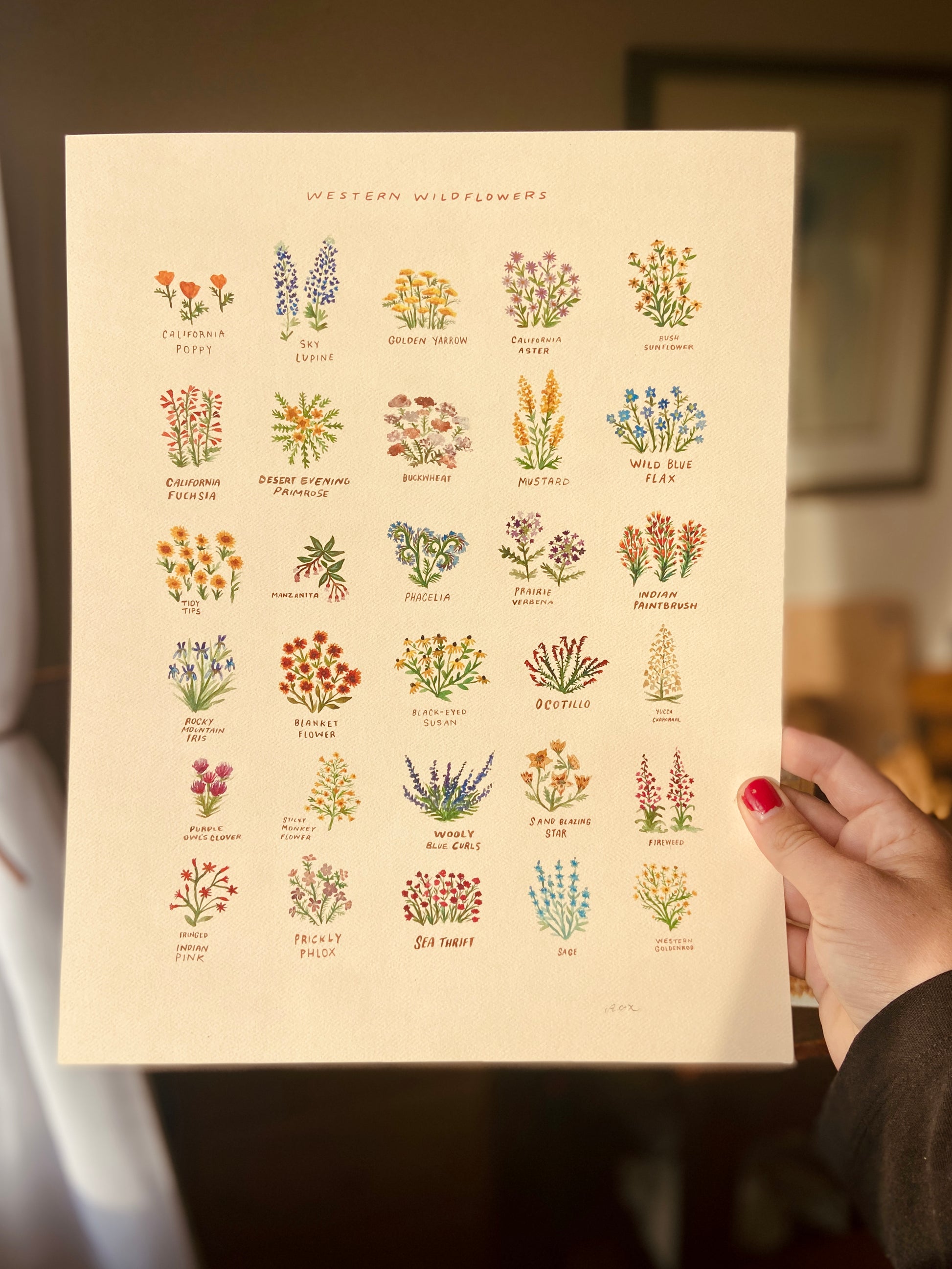 Some of the native wildflowers in this painting are: California Poppy, Sky Lupine, Aster, Bush Sunflower, Fuchsia, Desert Evening Primrose, Buckwheat, Mustard, Wild Blue Flax, Indian Paintbrush, Fireweed, Prairie Verbena, Phacelia, Manzanita, Tidy Tips, Rocky Mountain Iris, Blanket Flower, Black Eyed Susan, Ocotillo, Yucca, Sand Blazing Star, Wooly Blue Curls, Sticky Monkey Flower, Checkerbloom, Coyote Brush, Prickly Phlox, Sea Thrift, Sage, Purple Owl's Clover, Beavertail Prickly Pear, Indian Pink, Sea Fig, Golden Yarrow