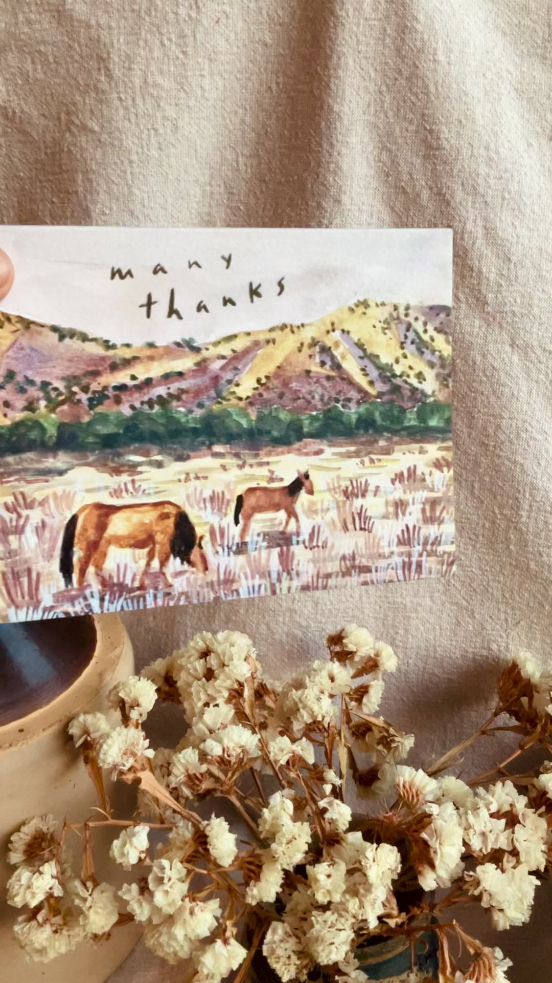 A happy little watercolor landscape painting of some horses in a pasture to tell someone thank you! A great pic for equine lovers, horsemen, ranchers, and cowgirls alike.